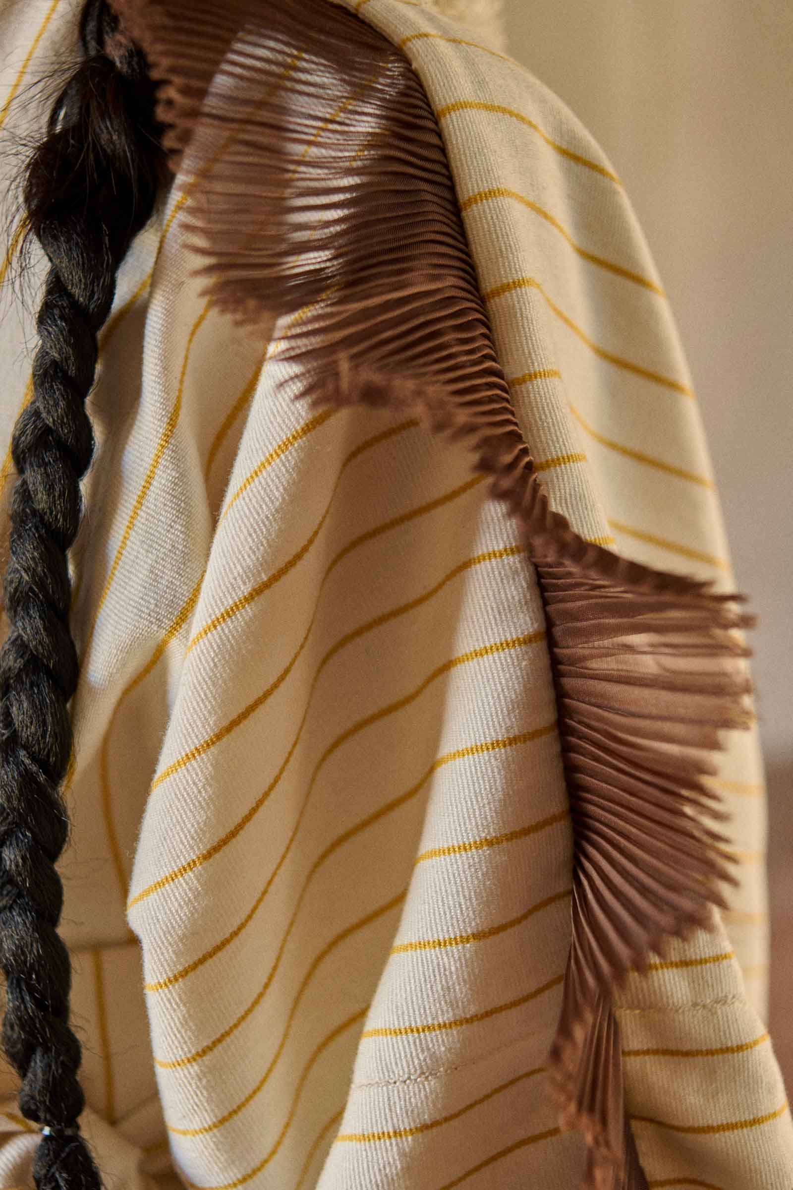 Blusa tejida en telar de cintura por la cooperativa Choy Spolavil de Santiago el Pinar y su elaboración tomó 30.6 horas de labor artesanal. Los terminados plisados fueron realizados en Aguacatenango, mientras que las tiras en los puños fueron elaboradas en telar de cintura por la cooperativa Bak Luch, con un tiempo de trabajo de 24 horas.