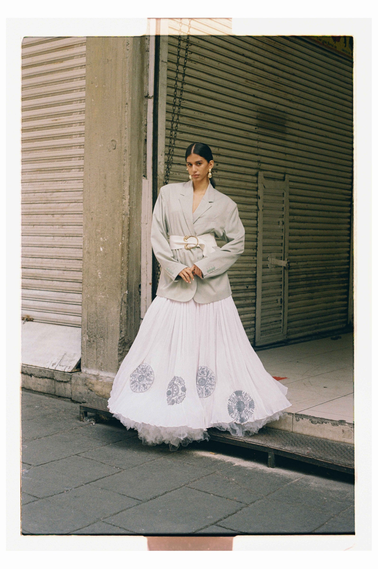 Falda plisada y bordada con flores elaborada en Aguacatenango, con una pretina tejida en telar de cintura en Aldama, y su confección total tomó 219.6 horas de labor artesanal.