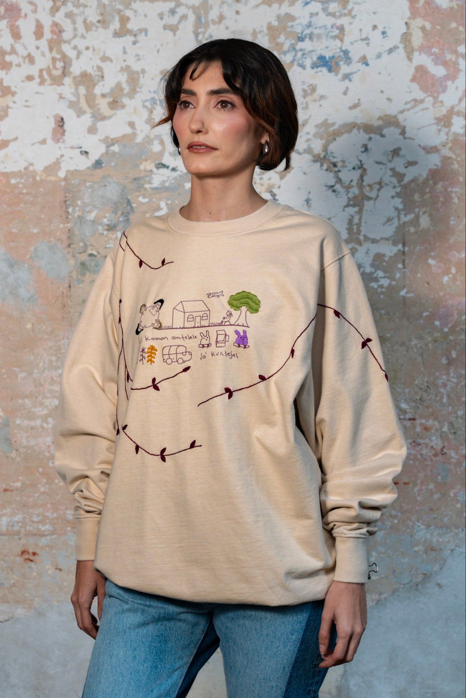 100% cotton. Hand-wash with similar colors in cold water. Use neutral soap. Do not use bleach. Do not wring. Hang dry in the shade. Hot iron.