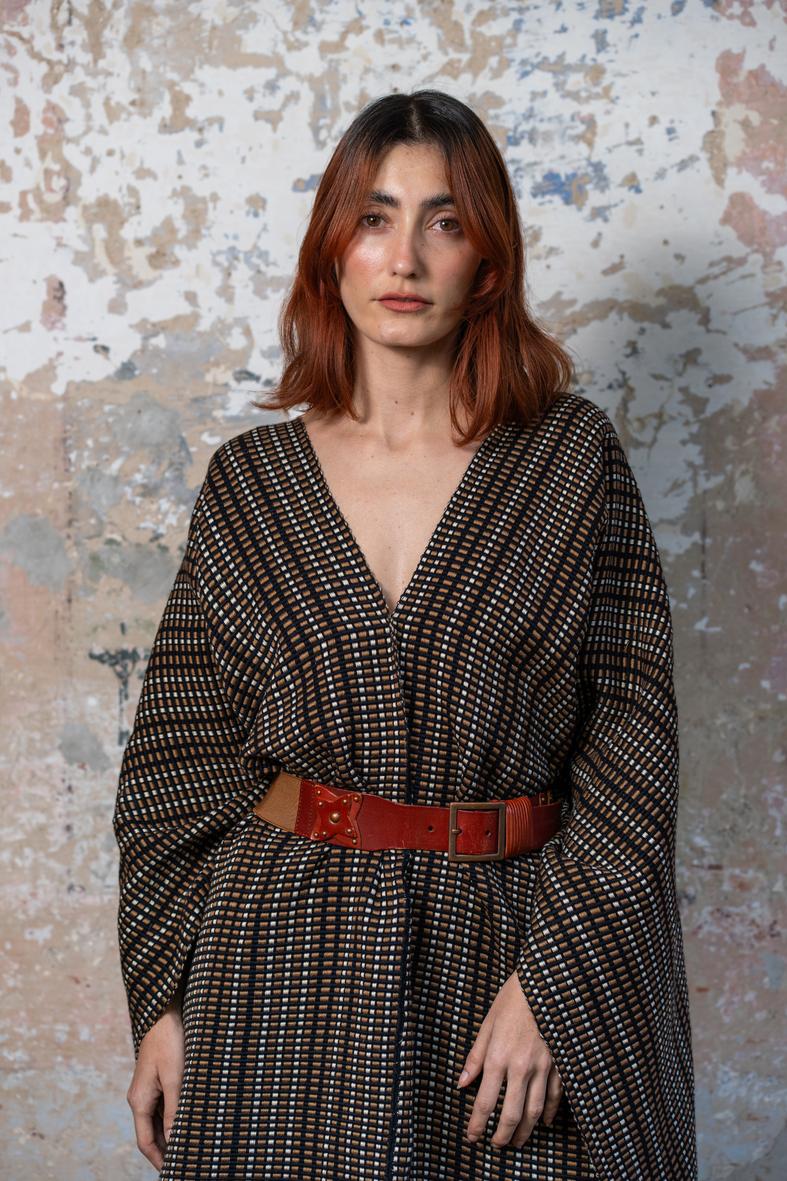 Poncho de tejido grueso y cálido hecho en dos lienzos de telar de cintura. Su elaboración toma 76 horas de trabajo artesanal. Cada pieza es única e irrepetible por lo que cada prenda puede tener pequeñas variaciones en el tejido.